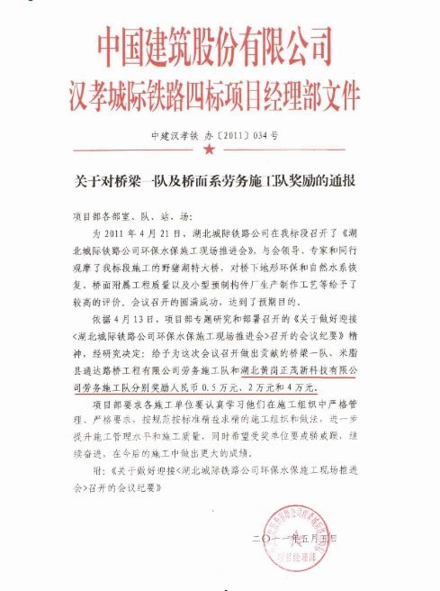 2011年4月21日,湖北城際鐵路公司的領(lǐng)導(dǎo)、專家和同行觀摩了我公司施工標(biāo)段——野豬湖特大橋,召開了《湖北城際鐵路公司環(huán)保水保施工現(xiàn)場(chǎng)推進(jìn)會(huì)》,對(duì)我公司的橋面附屬工程質(zhì)量以及小型預(yù)制構(gòu)件廠生產(chǎn)制作工藝等給予了較高的評(píng)價(jià),我公司獲得4萬元獎(jiǎng)勵(lì)金,會(huì)議圓滿成功。