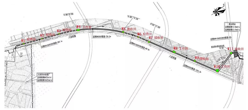 尾水管涵建設范圍南起于北湖污水處理廠,沿八吉府大道北側(cè)機動車道,止于武惠堤內(nèi)尾水泵站,承擔北湖污水處理后尾水輸送至尾水泵站排入長江。