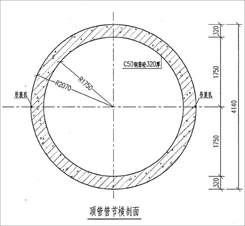 管涵全長約3.9公里,起點為北湖污水處理廠的出水井,止點為尾水泵站結(jié)合井,分別采用支護開挖方式和頂管施工方式。頂管施工達2.2公里,采用DN3500F型鋼承口式鋼筋混凝土管,管材外徑4140毫米,壁厚320毫米,長度為2500毫米,屬于超大直徑頂管。