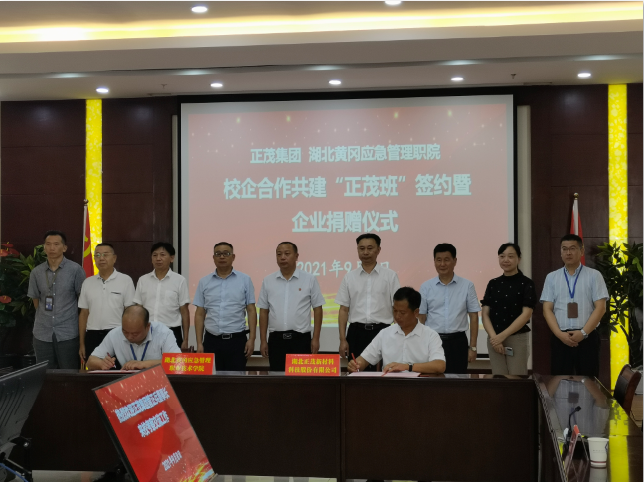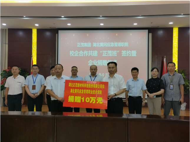 2021年9月8日上午,在湖北黃岡應(yīng)急管理職院七樓會議室,校黨委書記陳紅激情熱烈地歡迎湖北正茂新材料科技有限公司董事長管正兵一行的到來。緊接著公司董事長管正兵發(fā)表了熱情洋溢的講話,雙方就校企合作,開設(shè)“正茂班”有關(guān)話題達(dá)成共識,并舉行了校企合作共建“正茂班”簽約及捐贈。