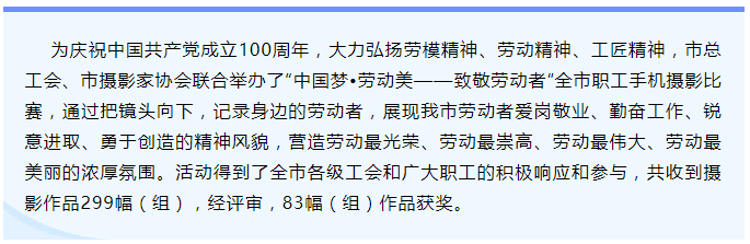 關(guān)于“中國夢·勞動美——致敬勞動者” 全市職工手機(jī)攝影比賽結(jié)果的通報